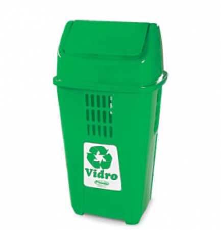 Capacidade: 50 litros. Dimensão: Largura 41cm, Altura 77,5cm. Disponível nas cores: Amarelo - Metal; Azul - Papel; Cinza escuro - Rejeitos; Laranja - Resíduos perigosos; Marrom - Resíduos orgânicos; Preto - Madeira; Verde - Vidro; Vermelho - Plástico.